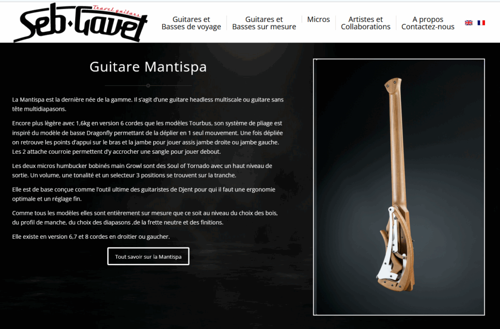 Sébastien Gavet dessine et fabrique dans son atelier des guitares et basses électriques qui s’articulent autours d’instruments nomades. Bourse de l’innovation du Salon des internationales de la guitare de Toulouse.